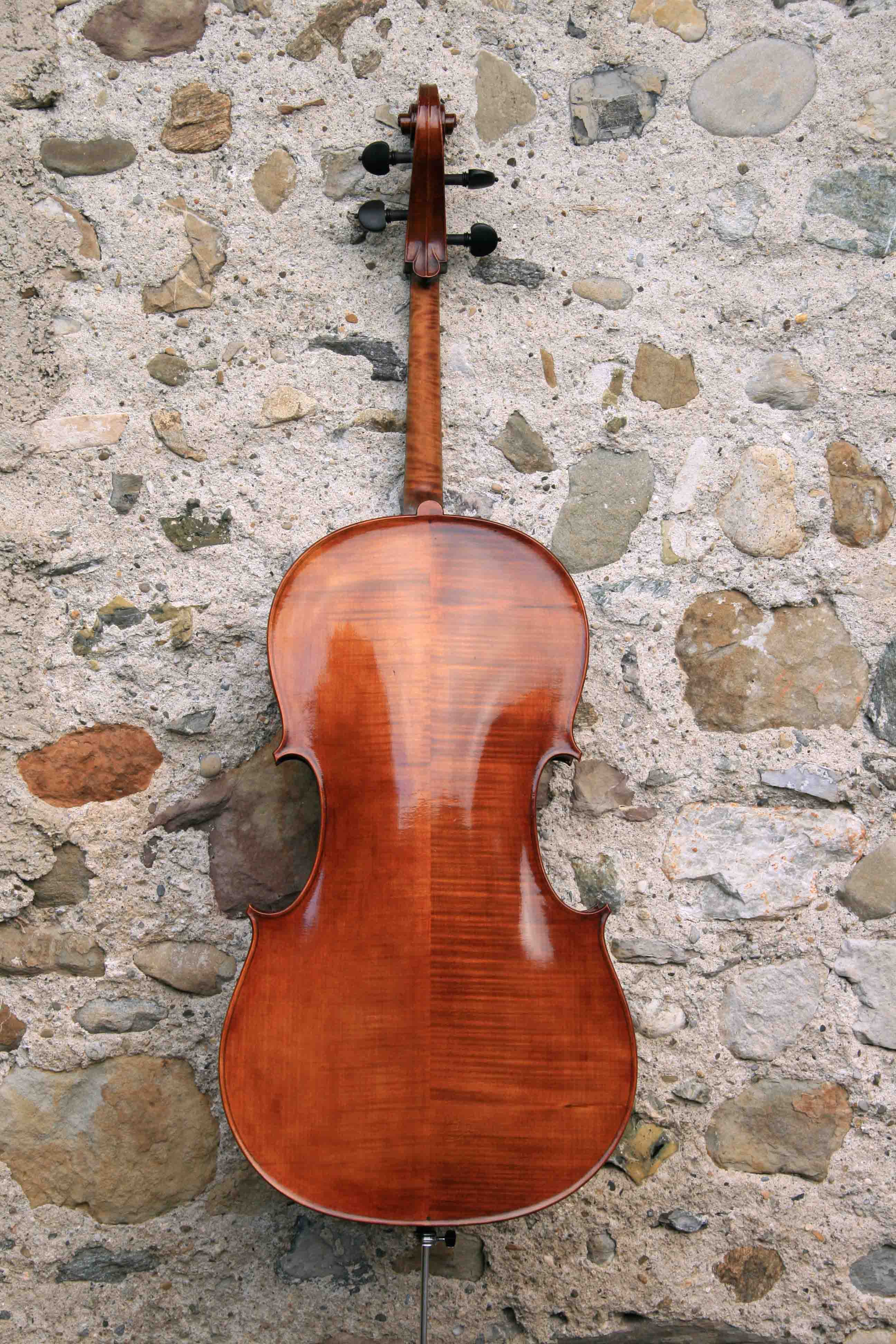 Dieses Cello ist ein Zusammenspiel zweier professioneller Entwicklungen, die mit einer gemeinsamen Ausbildung im Geigenbau vor über 20 Jahren in Bubenreuth begannen. Seit nunmehr 15 Jahren widmet sich Stephan Teichmann dem Studium alter und kostbarer Streichinstrumente in München. Ihm ist der Weißbau dieses Cellos zu verdanken. Er lässt seine Erfahrung in die Entwicklung des Modells sowie der Wölbungs- und Ausarbeitungskonzeption einfließen. Alexis Schilbach setzt seine bei der Restaurierung von Streichinstrumenten der klassischen italienischen Periode gewonnenen Kenntnisse in den Aufbau des Holzgrundes und in die Lackierung dieses Cellos um. Zwischen beiden Geigenbauern findet seit Jahrzehnten ein fachlicher und persönlicher Austausch statt. Dieses Cello ist eine Hommage an die Freundschaft.